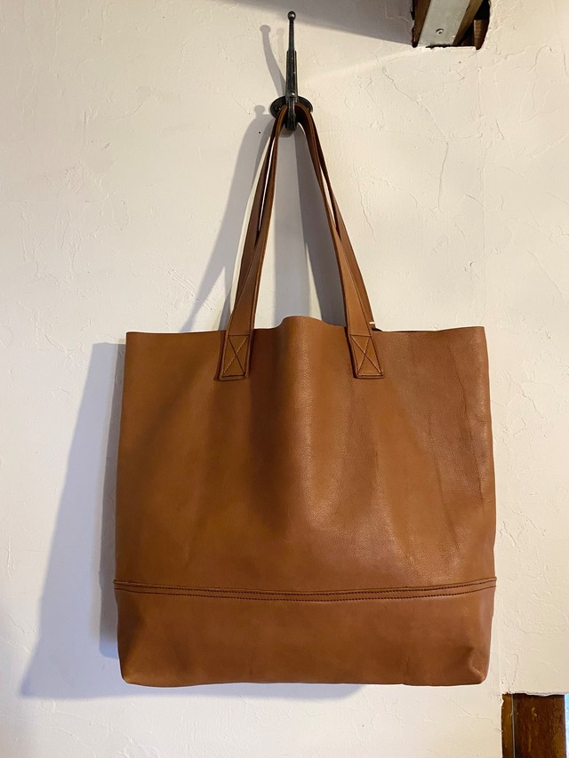 薄手の革で作られたレザーのトートバックです。 使い込んで丸めることが出来ます。 まだまだ日本でショッピングバックを持ち歩く事が 一般的ではなかった頃、旅先の北欧ではすでにそれが 普通の事で、みんなささっと自分の鞄に入れて帰るのが新鮮でした。 そんな光景がずっとどこかに残っていて、 日本だったら大根とか入れられちゃうくらいのとか 面白いんじゃないかと思って作り始めました。 薄手の革でお作りしているので、しばらく使っていると クタッと柔らかくなってきます。それくらいになったら クルクルっと丸めて、付属のベルトで巻いて 小さくして持ち歩く事も。 ナイロンのものよりは丸めても大きいですが 旅に連れて行くのも便利です。 丸めることを前提に作っているので、 内側などにポケットはありません。 貴重品などを入れておくのに、 紐付きの布袋を取ってに付けておいたり、 インバックを使うのもおススメです。 また両サイドを内側に折り曲げて 形を変えて使うのも可愛いですよ。 サイズは写真の通りです、ご覧くださいませ。 革は栃木レザー。植物タンニン鞣しのヌメ革です。 艶があり、張りもある素材です。 お使いいただくうちに、味わい深く色も手触りも 変化していきます。 hiyoriでは初期からずっと使わせていただいている革で 同じ素材でポーチやポケット、トートバックなど 多くの商品をお作りしていますので、 素材を合わせてお使い頂くことも出来ます。 今回特別価格 37000円→27000円 *只今ご用意があるものは若干の押し跡傷が付いております。使い込むうちに気にならなくはなりますが、写真をご確認の上ご購入下さいませ。(その分少しお値引きさせて頂いております) *価格は送料込みの価格です。 *hiyoriの商品は一つ一つ手作業でお作りしておりますので、革の伸び具合等の関係上サイズに若干の違いがございます。ご了承くださいませ。 *hiyoriの商品では、革の個性(牛さんそれぞれの、ほくろ、シミ、小さい傷等)はデザインに響かない程度にあえてそのまま使っています。その殆どは、使い込むうちに色が濃くなり、気にならなくなるものだったり、唯一無二のデザインの一部としてご理解頂けるくらいのものです。完璧なお化粧を施された革を使用しておりませんので、革の個性としてご理解頂ければと思います。気になるようでしたら、お問い合わせ頂くことも可能ですし、店頭にて直接ご覧いただくことも出来ます。