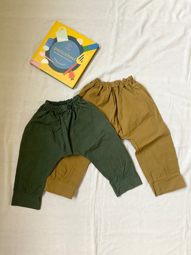 hiyoriの定番サルエルパンツのkidsサイズです。 サルエルといっても お尻がズルズルする程のサルエル具合ではなく、 また、子供の動きが邪魔になる程でもないので、 元気に遊んで頂けると思います。 動きが大きめの我が家の娘っ子でも大丈夫です。 生地は、お隣静岡県の浜松で 小ロットで手作業で丁寧に染め上げられ 天日干しで自然乾燥させた味わいのある綿です。 しっかりした厚みのある生地で マットな色合いで、アンティーク感がある色味です。 カーキは春夏のカーキに比べて もう少しスモーキーな深緑の雰囲気で 黄色ベージュはしっかりした黄土色な感じです。 80-90サイズとしてあるのは、 80くらいだとフルレングスの長さで、 90くらいだと8〜9分丈くらいで足首出して スッキリ履いて頂ける長さと言うことです。 まだまだ長いようでしたら、下の部分を 半分くらい折り曲げて履いて頂いて調節ができます。 子供たちが可愛い服で元気に遊べますように、 成長の早い時期ですが少しばかりでも長く履けますように、 お洗濯も早く乾き、シワを気にすることなく ママさんが少しでも助かりますように、 そんなことを考えながら作ったパンツです。 ウエストはゴムが2本入っています。 お子様に合わせて調整してあげて下さい。 *送料込みの価格です